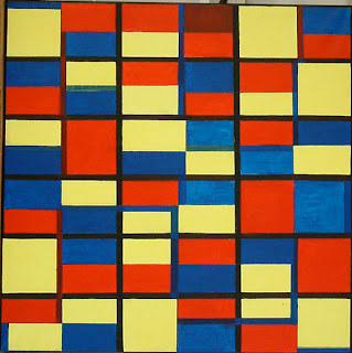 Een eerste poging om, niet al te ingewikkeld, met horizontale en verticale lijnen, vlakken en primaire kleuren te werken.