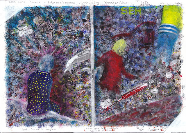 Ze mochten pas laat naar binnen, eerst moesten er foto's van de longen gemaakt en een echo van mijn hartkleppen. Weer naalden in me en actie met of bij mijn drain. Brandende longen, schurende en snijdende ademhaling.