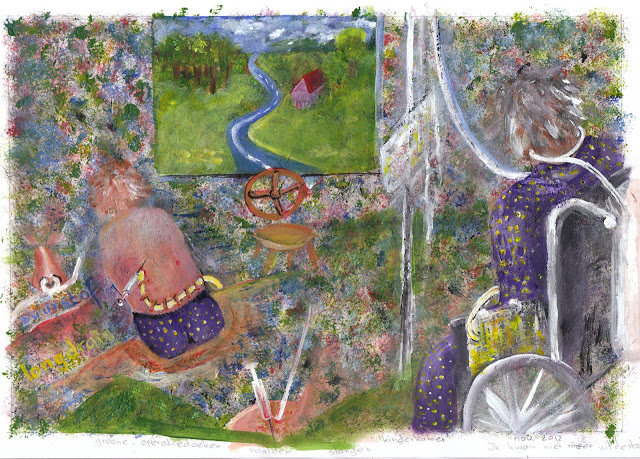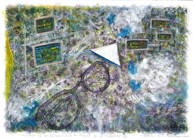 Het driehoekje bleef scherp en klein, dag en nacht. De tijd duurde en duurde in de nacht. en al die handschoenen (in de dozen aan de wand) en de gele jassen bleven me in de gaten houden. Om 6 uur in de ochtend vond ik dat de dag wel weer begonnen was (de verplegers vonden dat nog veel te vroeg) en vroeg ik om vertroostende warme melk.